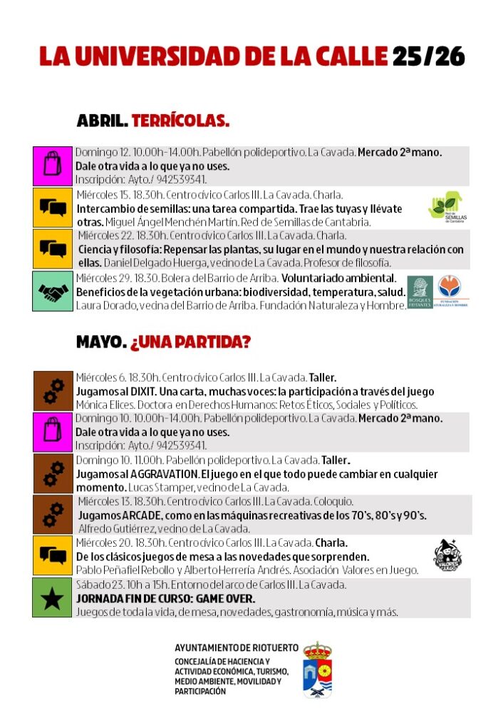 La universidad de la calle, el programa participativo del Ayuntamiento de Riotuerto, dedicará el cierre de curso a la naturaleza, en abril con ‘Terrícolas’, y a los juegos, de todo tipo, en el mes de mayo.