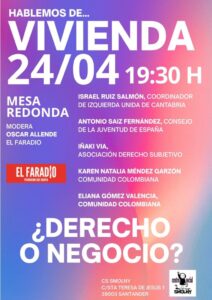 La mesa redonda estará moderada por el periodista Oscar Allende, de El Faradio. En ella intervendrán Israel Ruiz Salmón, coordinador de Izquierda Unida de Cantabria; Antonio Saiz Fernández, representante del Consejo de la Juventud de España; e Iñaki Via, integrante de la Asociación Derecho Subjetivo, una entidad centrada en la defensa del acceso a la vivienda como derecho.