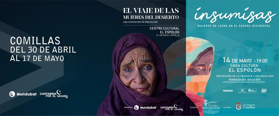 El municipio de Comillas acogerá del 30 de abril al 17 de mayo la exposición El viaje de las mujeres del desierto, de Ana Valiño, y el 14 de mayo, a las 19.00 horas, la proyección del documental Insumisas. Mujeres en lucha en el Sáhara Occidental, dentro del proyecto de sensibilización organizado por Mundubat y Cantabria por el Sáhara, con financiación del Gobierno de Cantabria, a través de la Dirección General de Cooperación al Desarrollo.